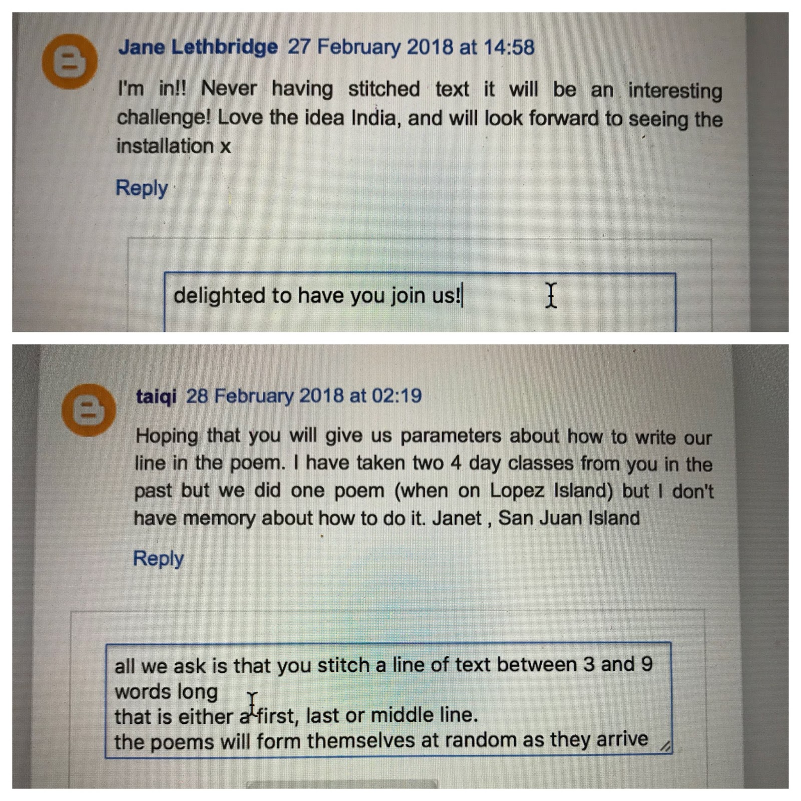 then all the pieces will be stitched together by me (and some friendly volunteers) next February to form three-line poems, which will be installed at the Woollen Mill Artspace in Lobethal, South Australia together with a cloud of suspended flowers.